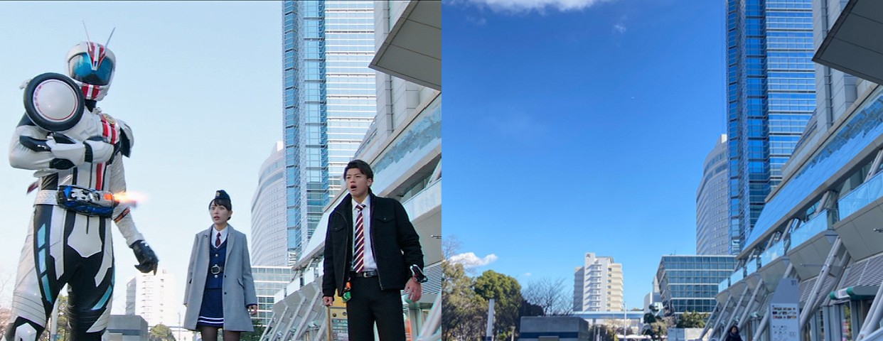ドライブ 20 第20話 西城究はいつからロイミュードだったのか 究の出版記念サイン会へと向かう剛たち 爆発したビルに向うため、マッハに変身した剛とその行動に唖然とする霧子と泊 東京都江東区有明3-6-11 TFTビル東館南側通路 2025.2