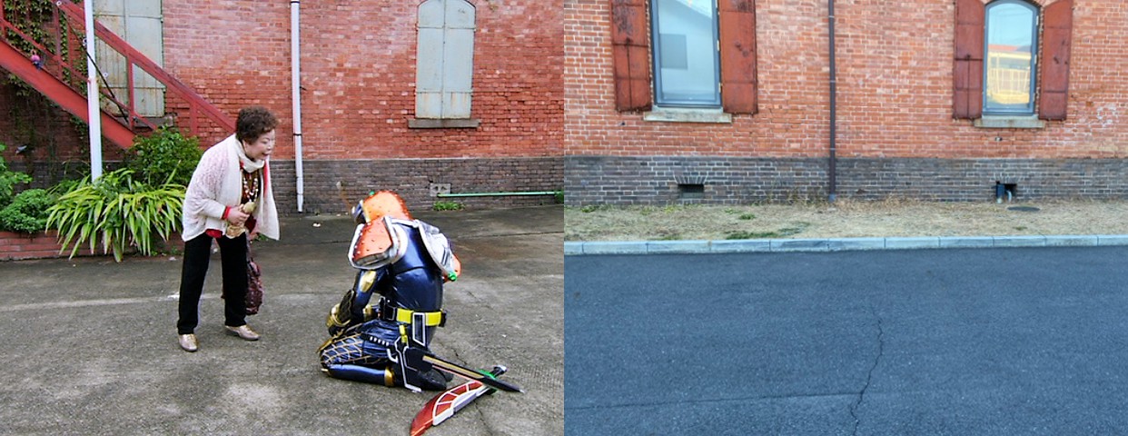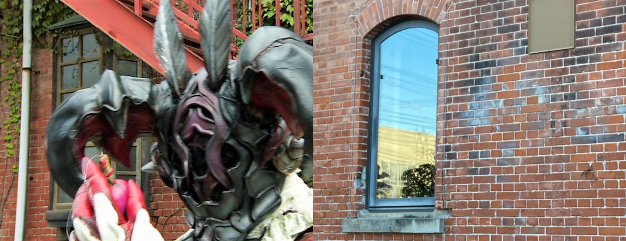 ガイム 09 第9話 怪物インベス捕獲大作戦! インベスの出現を待つ龍玄たち 女性に叱られる鎧武 上空から降り立ったコウモリインベス 果実を手にするコウモリインベス 埼玉県本庄市銀座1-7-16 旧本庄商業銀行煉瓦倉庫 2025.1