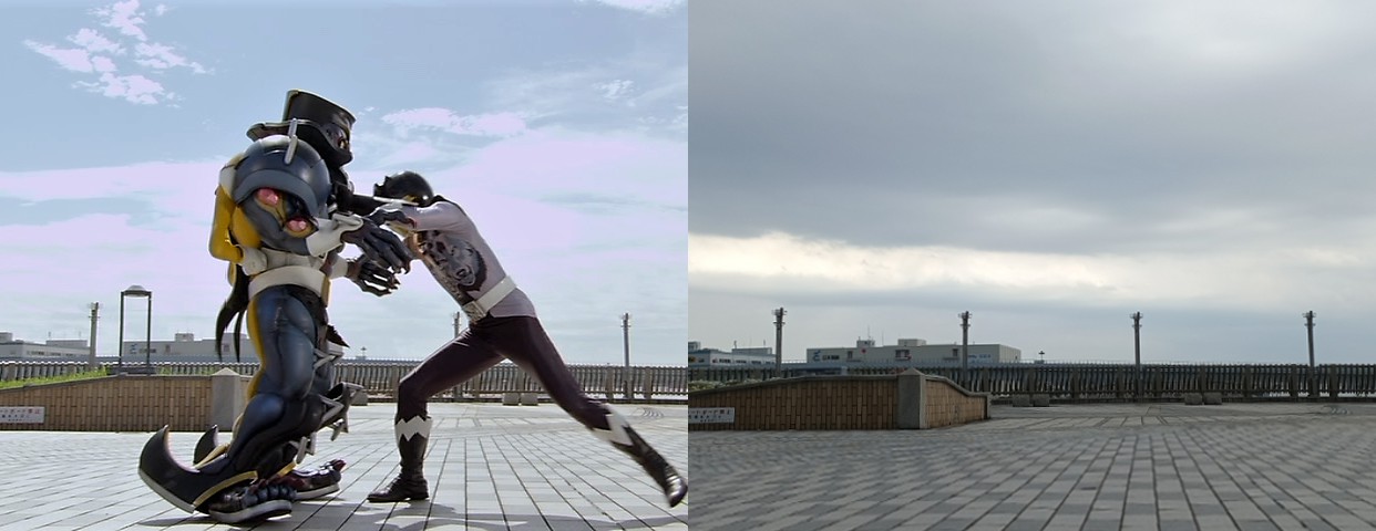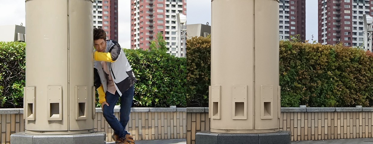 | オモテウリャーに立ち向かうアムたちと照明柱の影から出てきた門藤 |