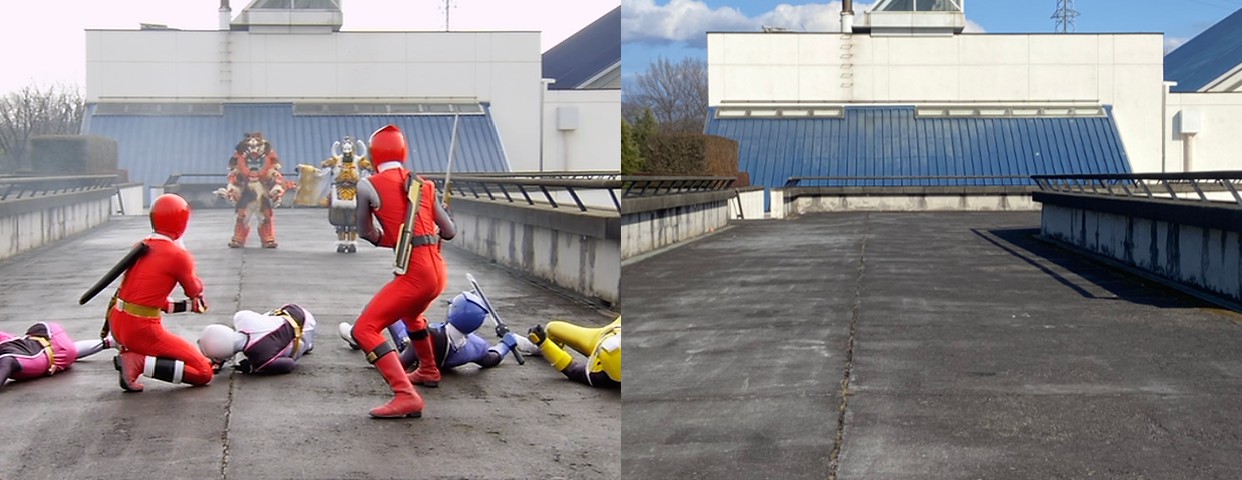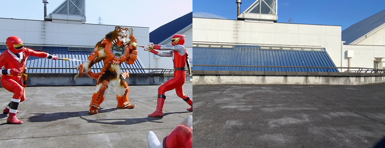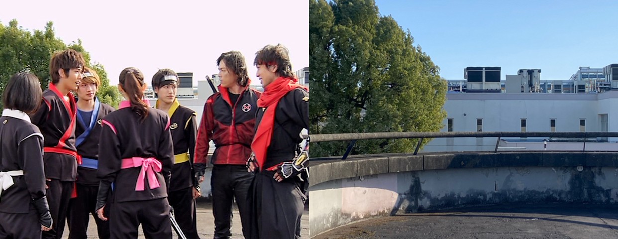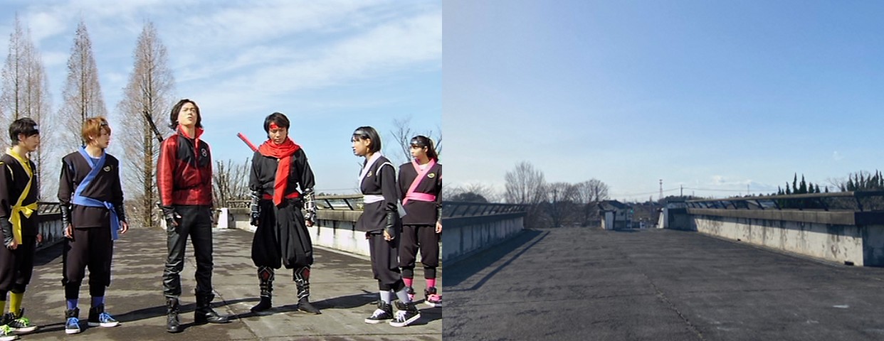 | アカニンジャーを踏み台にしてネコタマに攻撃するニンジャレッドとハリケンレッド |